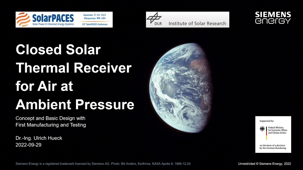 - Lecture video Dr. Ulrich Hueck: “Closed Solar Thermal Receiver for Air at Ambient Pressure“