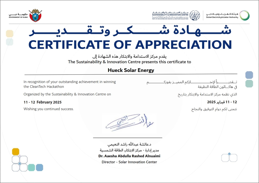Winner of the “CleanTech Hackathon” by energy provider Dubai Electricity & Water Authority (DEWA) in the United Arab Emirates. Presentation and exhibition of solar thermal receiver models at the Cleantech Innovators Exhibition from February 24 to 26, 2025, at the Sustainability & Innovation Centre of the Mohammed bin Rashid Al Maktoum Solar Park near Dubai.