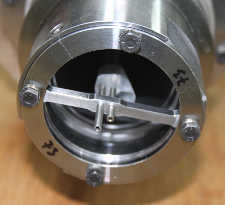 - Ein Federelement gleicht die unterschiedlichen Wärmedehnungen des metallischen Innenrohrs gegenüber dem keramischen Außenrohrs aus.