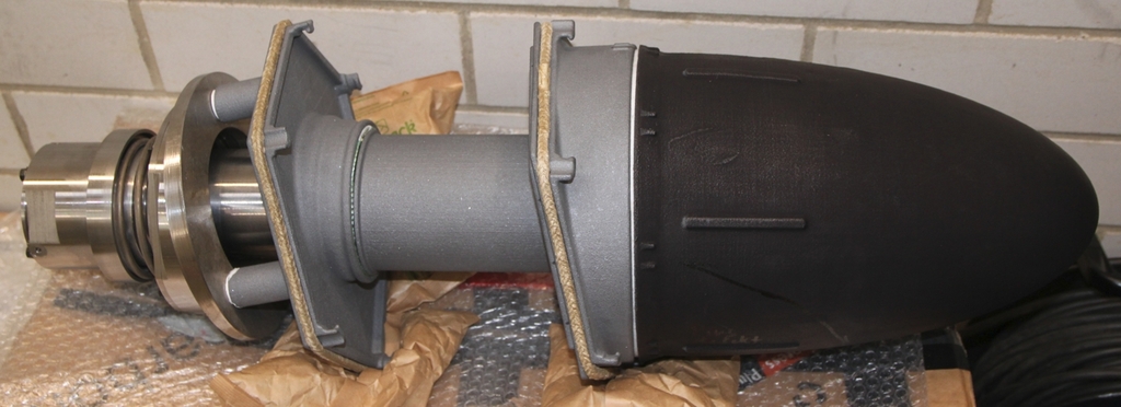 Das auf dem Foto gezeigte Receiver-Modul hat eine Länge von ca. 75 cm und ein Gewicht von ca. 25 kg. Länge und Gewicht sind abhängig von der Auslegung der Breite des grauen Heißluftkanals. Das kreisförmige Metallteil links, auf dem sich die keramische Rückwand des Heißluftkanals abstützt, ist ein Teilausschnitt der großen, metallischen Wandung des Kaltluftkanals.