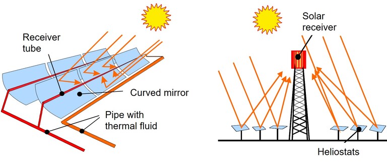 Bei diesiger Luft haben CSP-Parabolrinnenanlagen einen Vorteil gegenüber Solarturmanlagen: Die weit verteilten Receiver-Rohre befinden sich in der Brennlinie der rinnenförmigen Spiegel. Daher ist die Wegstrecke, welche die reflektierte Sonnenstrahlung vom Spiegel zum Receiver zurücklegen muss, sehr kurz.