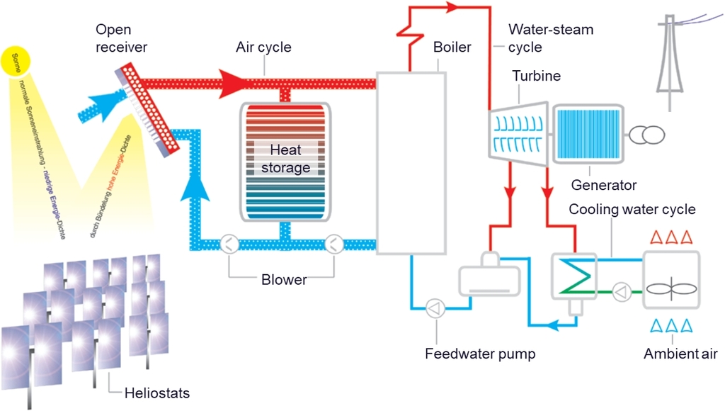 Bei der Verwendung von druckloser Luft als Wärmeträgermedium gilt grundsätzlich, dass der Energieaufwand für den Transport dieser Luft bei vergleichbaren Prozesstemperaturen einen etwas geringeren Gesamtwirkungsgrad des Solarsystems erzwingt, als bei CSP-Anlagen mit Wärmeträgermedien wie flüssigem Salz oder flüssigem Natrium oder bei den sehr hohen Temperaturen von Partikel-Receivern theoretisch erreicht werden kann.