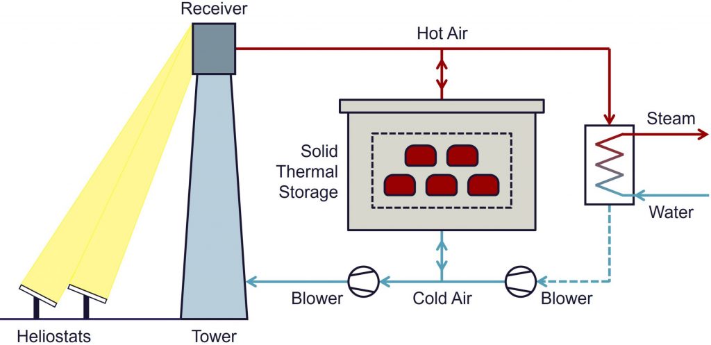 - Der elektrische Eigenverbrauch für den Betrieb des Receivers tritt nur bei Tag auf, wenn PV ohnehin günstigeren Strom liefert, als CSP es vermag. Wenn dagegen nachts nur der Wärmespeicher von Luft durchströmt wird, dann ist der elektrische Eigenverbrauch der CSP-Anlage deutlich geringer. Zugleich kann nachts das Mehr an Netto erzeugtem CSP-Strom zu besseren Preisen verkauft werden, weil PV keinen direkt erzeugten und damit preiswerten Strom liefert.