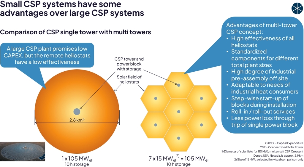 - Nur der solarthermische Receiver ist neu, alle anderen Komponenten sind bereits etabliert und bankfähig im Sinne der Finanzierung des Anlagenbaus.