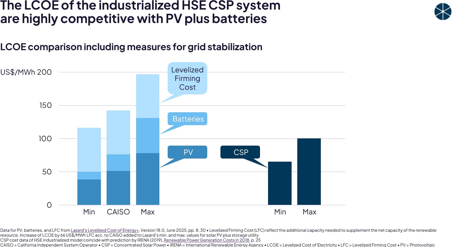 Aufgrund des Industrialisierungspotenzials kann die HSE-Technologie den für CSP prognostizierten Kostenkorridor erreichen: „... the cost of electricity from CSP will potentially fall into the range of 6 to 10 US$ct/kWh.” Quelle: IRENA (2019), Renewable Power Generation Costs in 2018, p. 25
